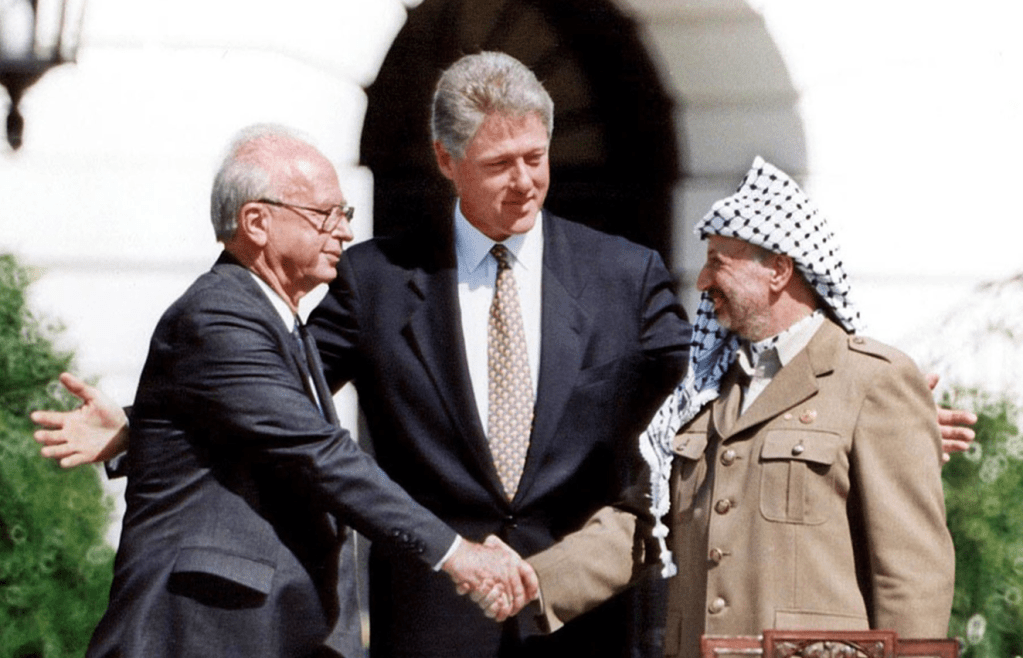 - On this week in history (Sept 13, 1993): In a famous gesture of hope for a peaceful future, Israeli Prime Minister Yitzhak Rabin and PLO Chairman Yasser Arafat shook hands with Bill Clinton — and each other — at the signing of the Oslo Accords. The peace efforts won Rabin and Arafat the Nobel Peace Prize, along with Israeli statesman Shimon Peres, but the promises of the agreement have not come to fruition, thwarted in part by Rabin’s assassination in 1995.