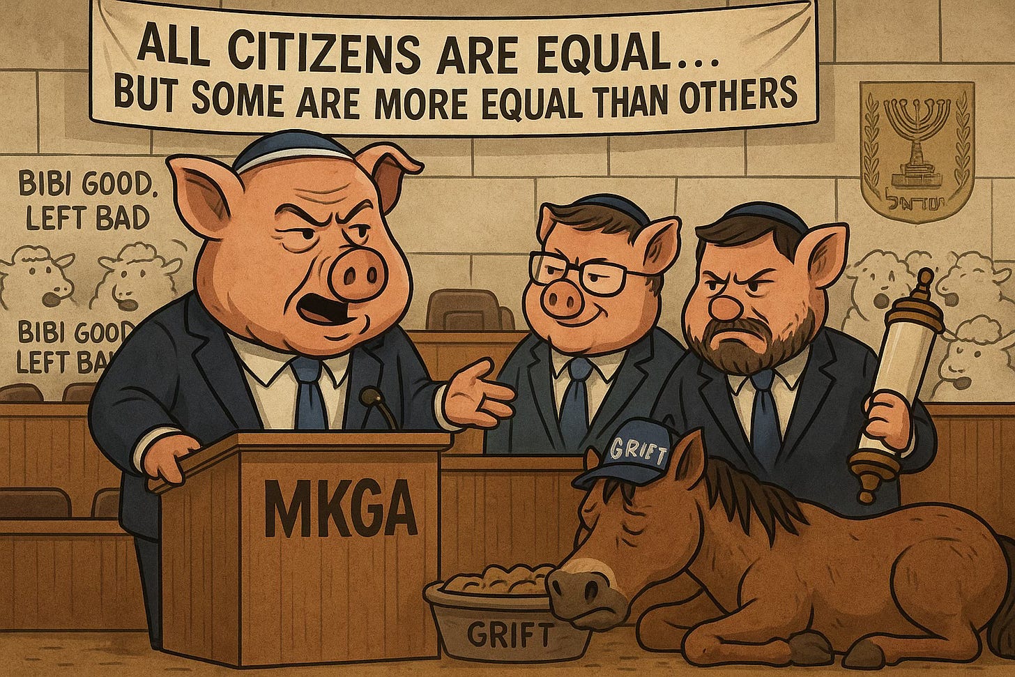The judicial overhaul? That was the pigs deciding that “some animals are more equal than others.” The selective drafting of Haredi men? That’s Boxer doing all the fighting while the pigs hold Torah scrolls over their heads and call it divine exemption. The attempt to fire the Attorney General, the weakening of liberal education, cultural institutions, and the press? That’s the sheep bleating “Bibi good, Left bad” on command.